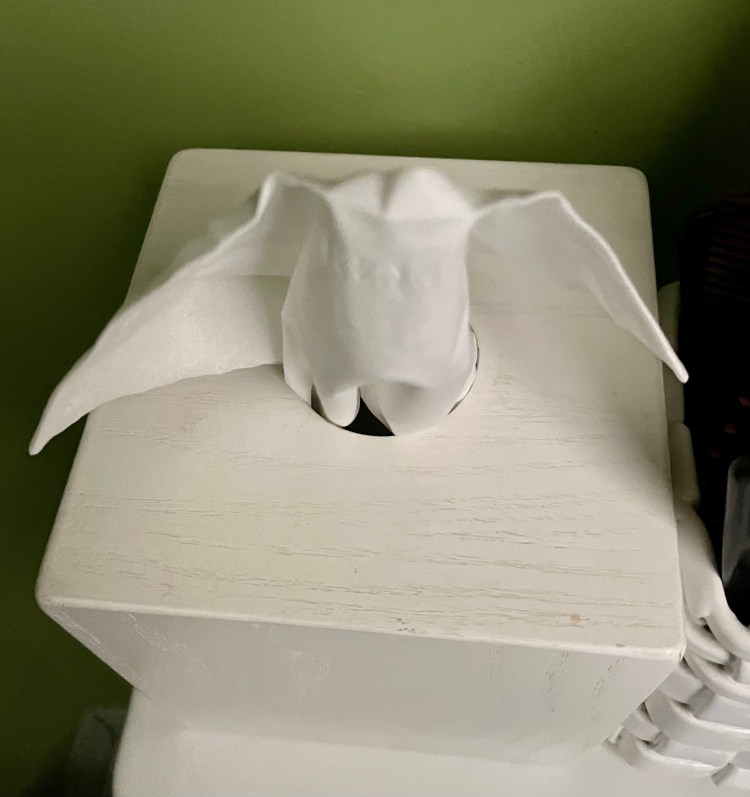 The most absurd example of my eyes and brain trying to identify everything around me came yesterday as I approached a box of tissues. What kind of bird is that, I wondered as I looked at the tissue poking out of the top of the dispenser. Or does it look more like an airplane?