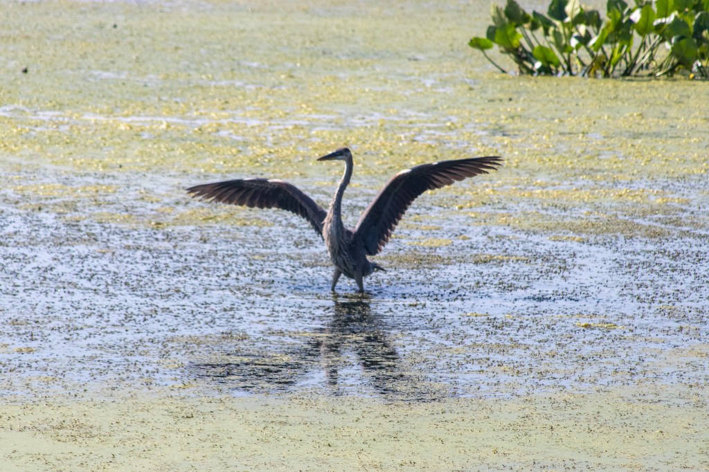 I spent most of my 90-minute visit on the Wetland Loop Trail and the Big Boardwalk Loop Trail, with some time in the Warbler Woods. One of the trails was blocked as a work crew was repairing what I assume was recent storm damage. I diverted onto the boardwalk across the Emergent Wetland, a big, lake-like area where I saw several great blue herons, a great egret and one delightfully noisy belted kingfisher.