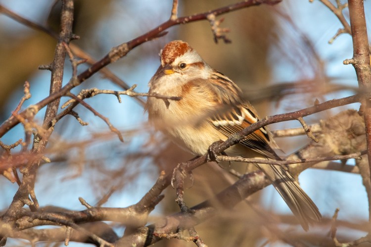 My usual procedure is bring up the binoculars first to get the best chance at identifying the bird, then hope it sticks around long enough for me to get a photo or two. This time, however, I raised my camera right away and aimed. The bird was nestled in branches, giving my camera’s auto-focus fits but I was virtually certain I was seeing an American tree sparrow.