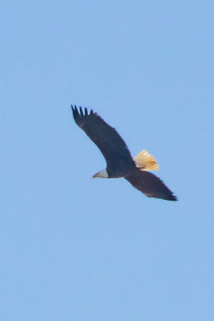 That’s the route I took Friday, and I had great looks at two mature and one immature eagle that had flown into the trees along the shore. One took off right overhead, as seen in the shot topping this post.