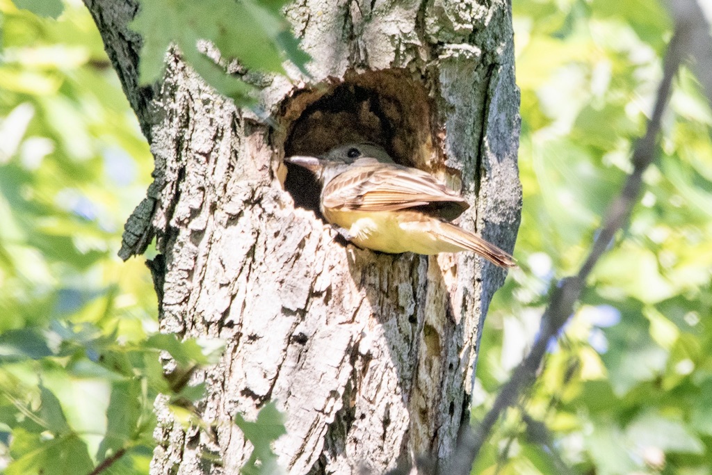 I can’t recall exactly how things played out, but it seemed there were two flycatchers coming in and out of the tree. Then Laura spotted a round opening in a dead spur of the trunk, about three-quarters of the way up the tree.
