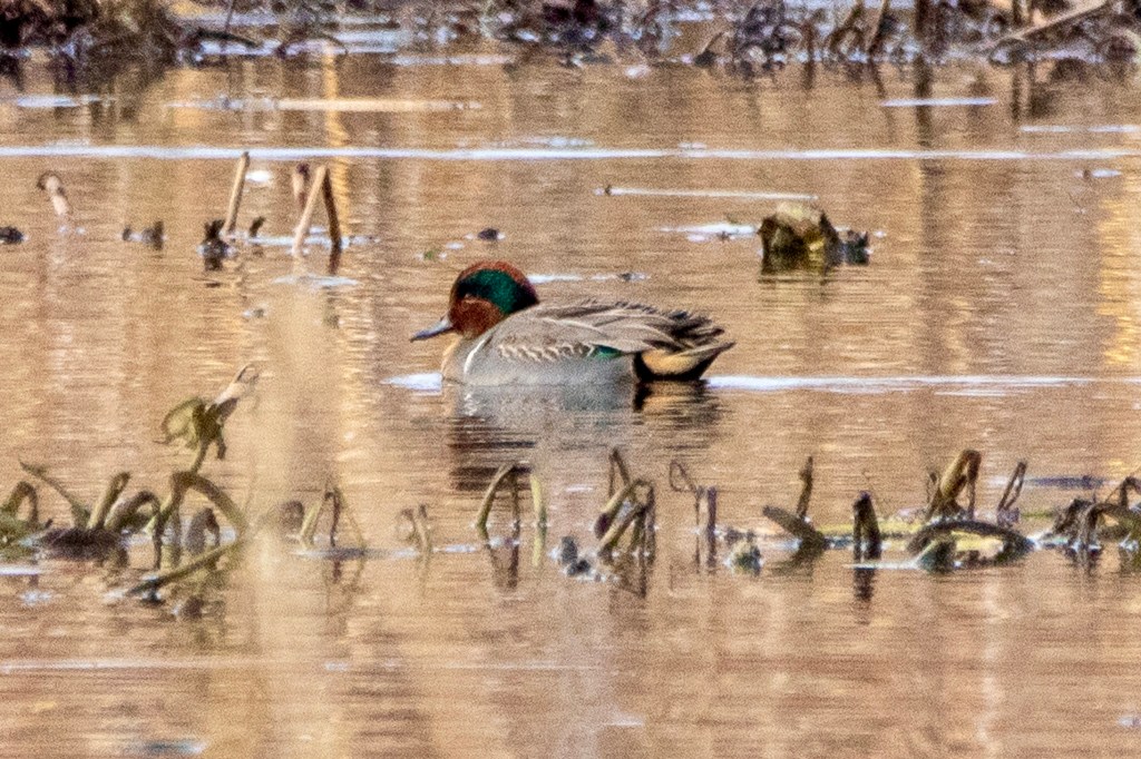 On the way back to the parking lot, the section of the marsh that had been bird-barren on our first pass was now teeming with waterfowl. Although I didn’t get any worthwhile photos of them, many American black ducks were plying the waters.