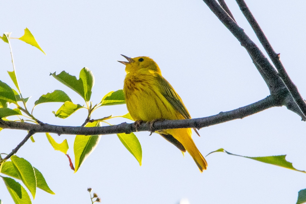 My outings have been limited of late, so I’ve been a bit behind my warbler counts of previous years. I had been hearing yellow warblers singing in some of the usual spots where they congregate at the Mercer Meadows Pole Farm, but until yesterday I had not put my eyes on one.