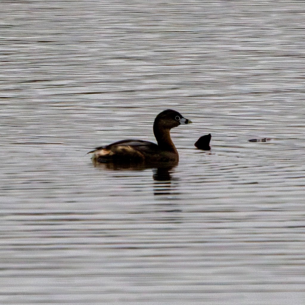 A short while later, the woman — Stephanie — spotted a second grebe. They were fairly close to each other, and for a while it seemed one or the other was underwater. Finally, they started diving nearly synchronously. The sky was heavily overcast, so conditions weren’t great for photos. I never did get a clear shot of both of them floating, so I had to settle for a couple of frames of one of them.