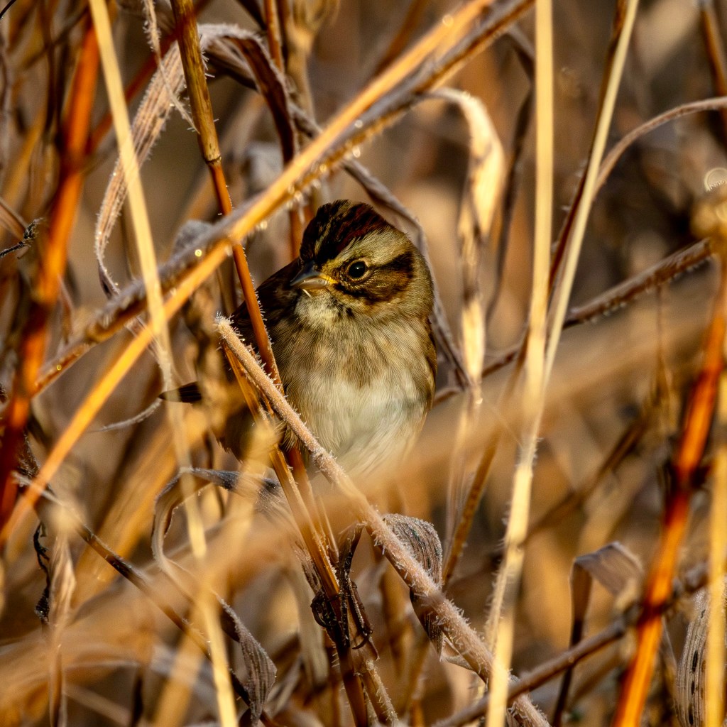 Merlin was also hearing swamp sparrows, and I eventually got a firm ID on one farther along. Through my binoculars, I could see one tucked in the tall grasses. I pulled up my camera and managed to get focus lock for a couple of clear shots.
