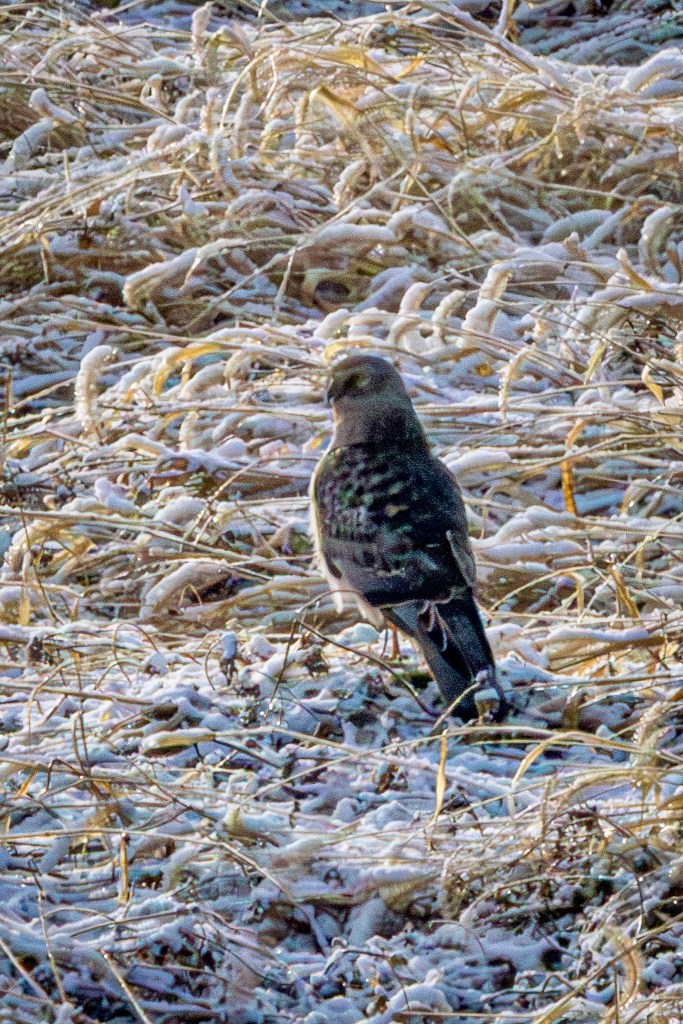 I gained a lifer in the rough-legged hawk, which we spotted a second time on our way back up the road. It flew from one post to another, so we drove a bit to see it clearly and closer on the second post. As soon as I pulled my camera out of the car, the bird flew off. I believe Jim got a shot of that, and we decided it was time for us to head off, too. π¦