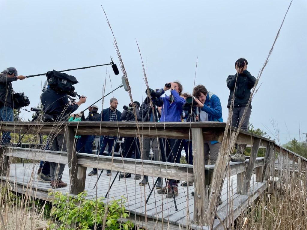The Tiger Shrikes in action at Coral Avenue Beach, Cape May. The cameras and microphones are from a film crew doing a documentary on the World Series of Birding for HBO.