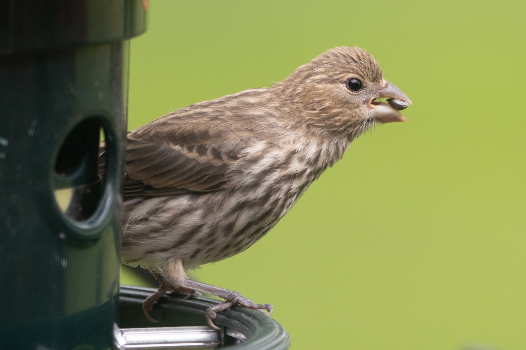 A house finch cracks a sunflower seed she’s just extracted from one of the feeding ports on the Squirrel Buster Plus. Note the half-closed feeding port at left.