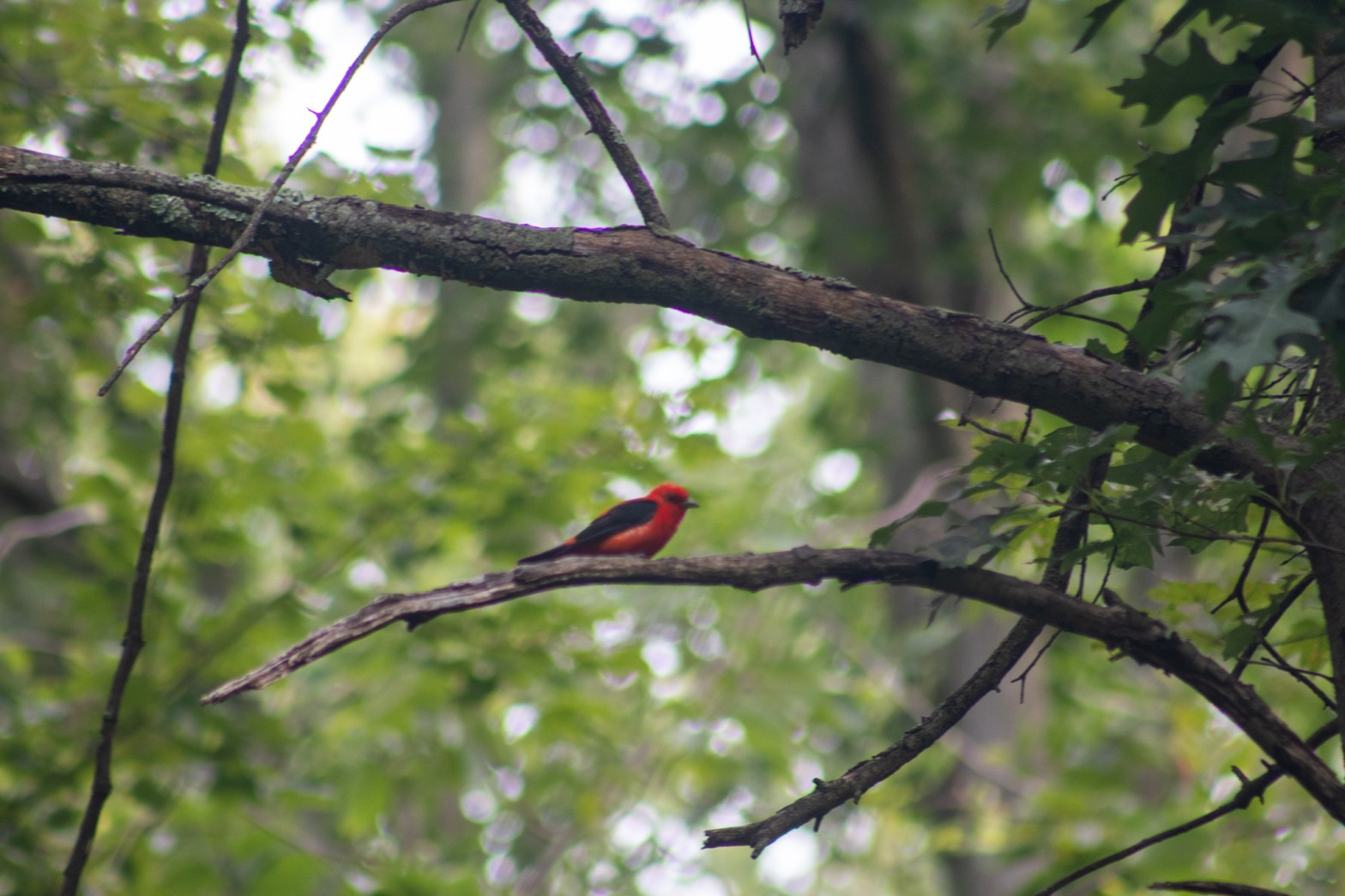What a thrill! I finally got a good look at scarlet tanagers today out at the Mercer County Pole Farm. I had only seen a scarlet tanager once before, during a previous summer when on a bicycle I flushed one from the trail-side brush. That was only a glimpse, but the sighting was a no-doubter:Continue reading “The colors of the day: scarlet and indigo”