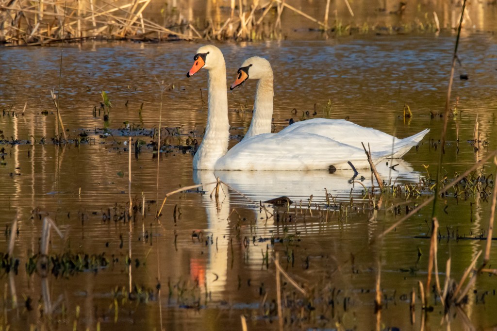 Rather than walk around the lake, on most visits I head to the right from the parking lot to the marsh that’s adjacent to the lake, with a two-lane path that runs between them. The marsh is much narrower than the lake, and it’s a great vantage point from which to see ducks and geese and, most times, a pair of mute swans who have been living at the marsh for several years, long-time visitors have told me. The swans also hang out on Silver Lake. [Note: in Spring 2025, the mute swans disappeared. As of the end of the year, they had not returned.]